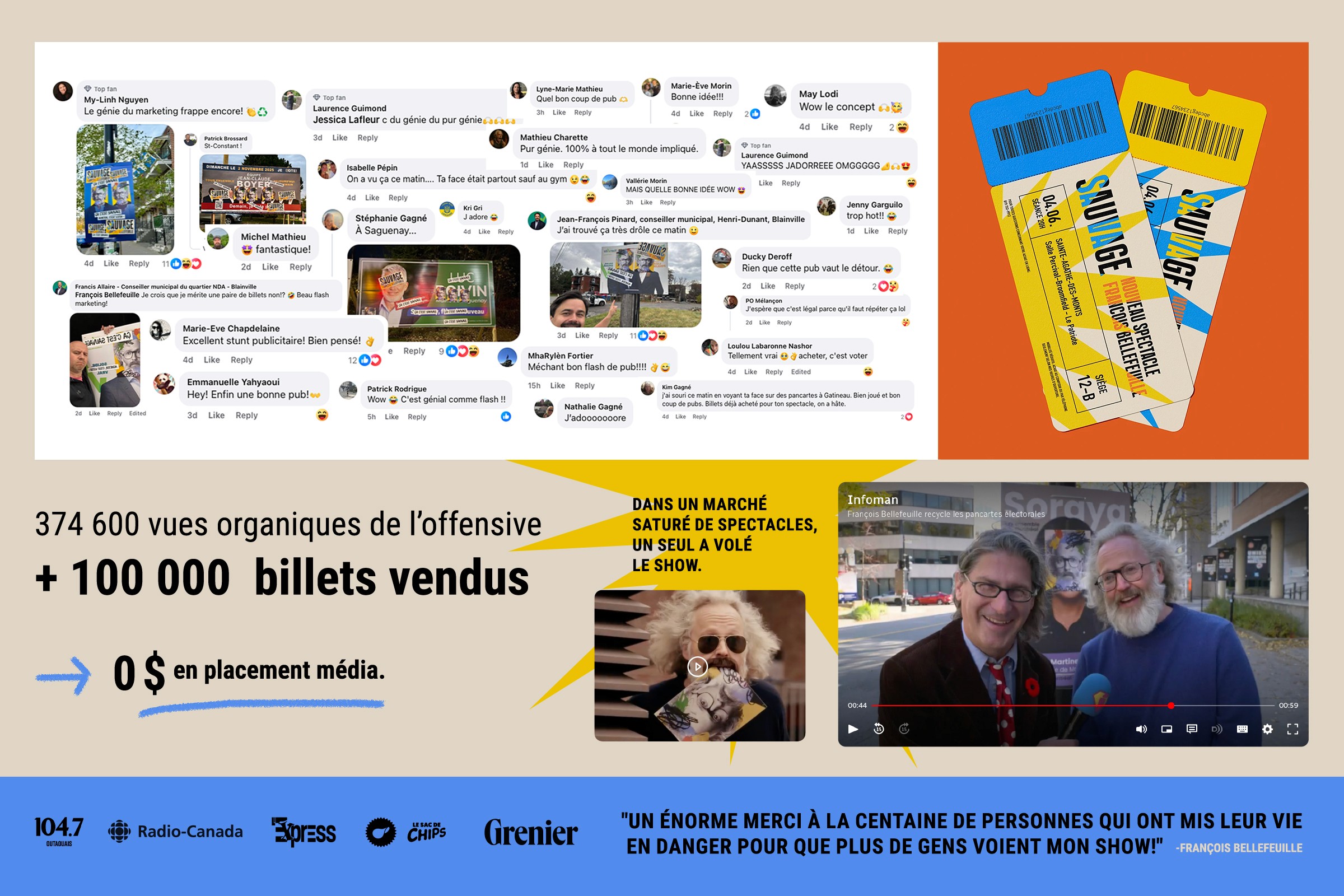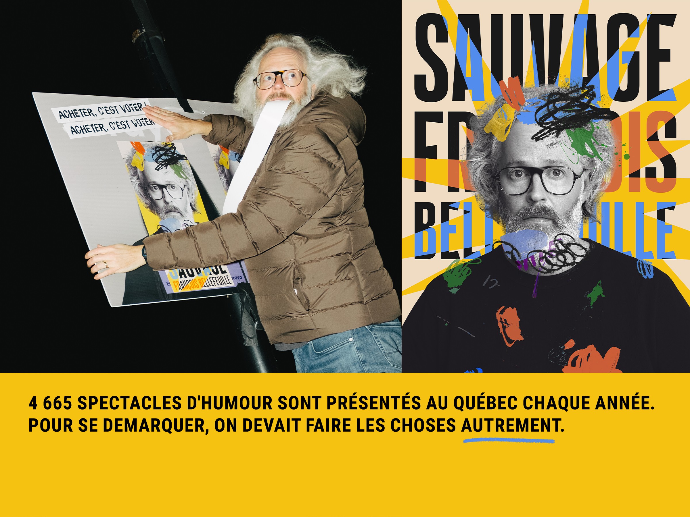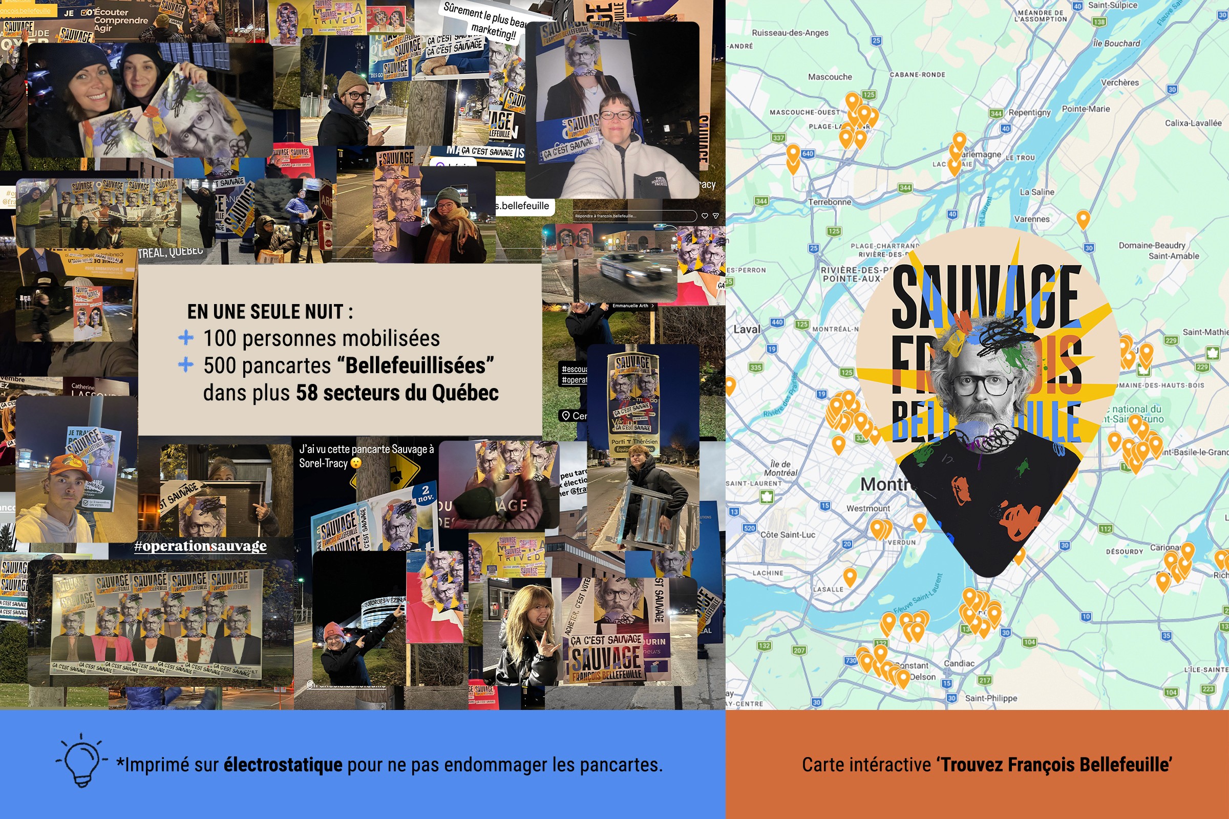 Le 2 novembre 2025, alors que le Québec était en pleine campagne électorale, une nouvelle « candidature » est apparue sur les poteaux : celle de François Bellefeuille. Durant une seule nuit, 100 personnes réparties en 50 escouades ont couvert 58 secteurs à travers la province, remplaçant les visages des candidats politiques par celui de l'humoriste, accompagné du message : « ÇA C'EST SAUVAGE ». Sans aucune ponctuation, pour être encore plus sauvage. Les impressions réalisées sur électrostatique permettaient aux candidats de récupérer leurs affiches intactes. Une carte interactive géolocalisait chaque installation en temps réel. Le stunt a été repris spontanément par Infoman et a généré 374 600 vues organiques sur les réseaux sociaux, sans aucun achat média.